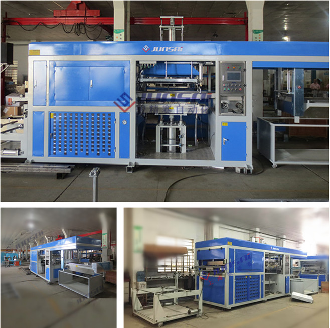 主要結(jié)構(gòu):是由給料、拉料、上下電加熱爐、下閘、多功能可調(diào)尺寸、下模盤、上模、上閘、刀閘、切片、放片及配以真空裝置等構(gòu)成;以氣動裝置為主動力源,本機(jī)拉片、送片采用電動、減速器,時間繼電器,中間繼電器,行程開關(guān)等電器組成全自動控制系統(tǒng)。成型適合的材料有:APET,PETG,PS,PVC,PC,PP等。