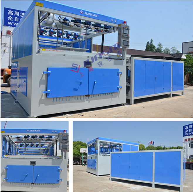 汽車頂棚吸塑機(jī)【工作原理】:將塑料片材加熱后,在成型站完成成型動(dòng)作及產(chǎn)品定型,由鏈條將成型后的半成品輸送出來,再由自動(dòng)沖切站完成送料、沖切和堆疊、計(jì)數(shù),并將設(shè)計(jì)數(shù)量的產(chǎn)品自動(dòng)推到包裝平臺(tái),邊角料自動(dòng)卷曲成卷,完成產(chǎn)品的制作。